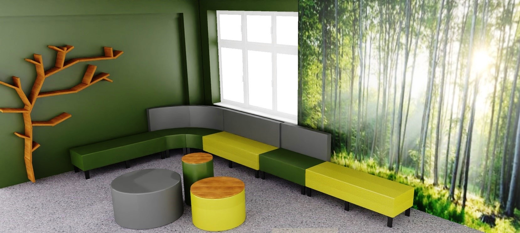 Strefa relaksu w szkole - siedziska Snake i okrągłe pufy okrągłe Volt (wizualizacja)